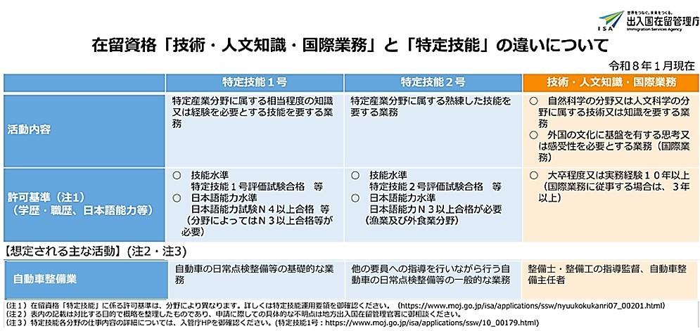 下記「技術・人文知識・国際業務」に該当するエンジニアとして認められるためには、整備や板金・塗装のような作業技術に留まらず、点検、診断ができるレべルの専門知識が求められます。