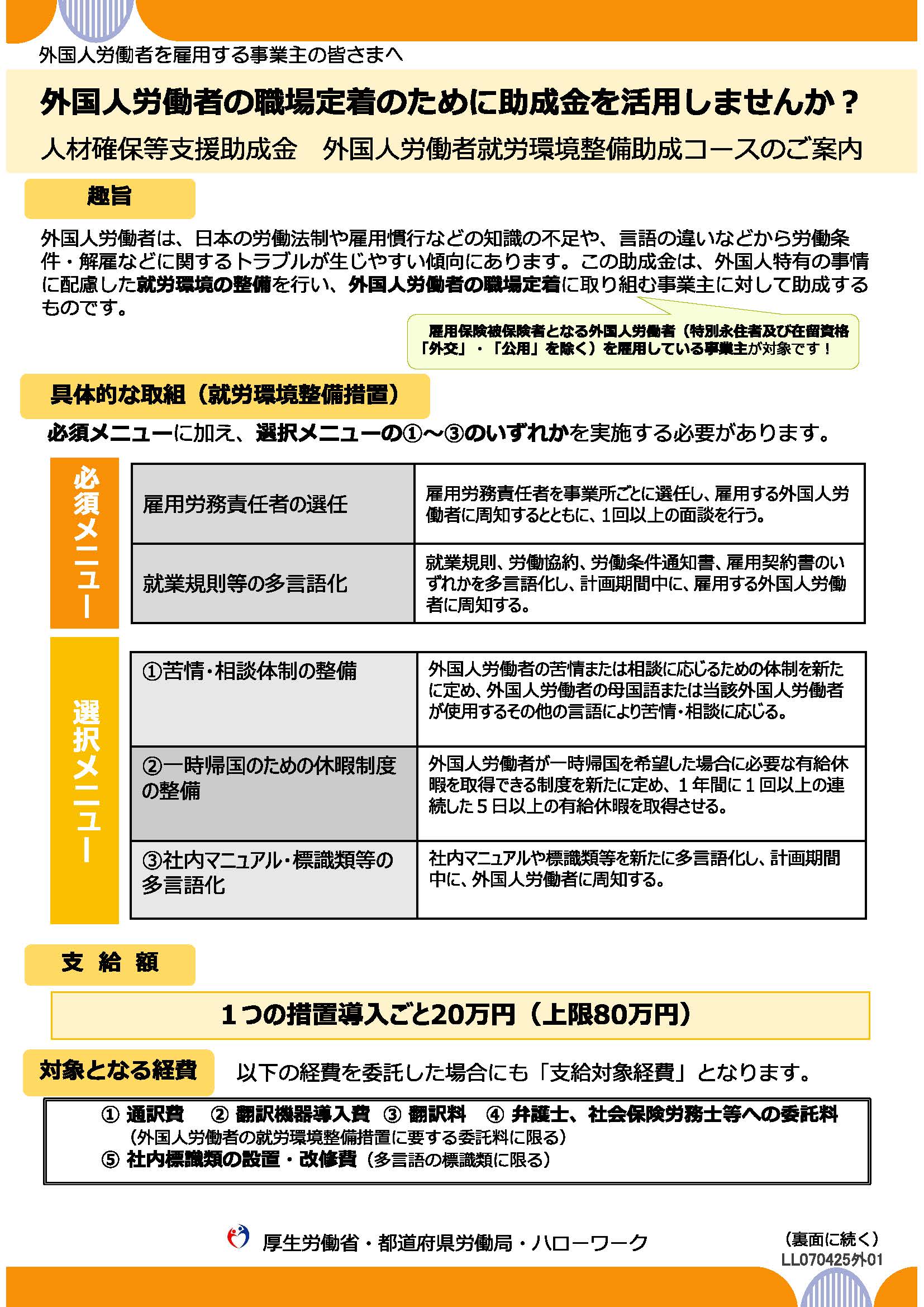 この助成金は、外国人特有の事情に配慮した就労環境の整備を行い、外国人労働者の職場定着に取り組む事業主に対して助成するものです。