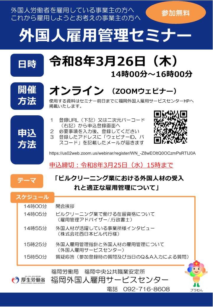 福岡外国人雇用サービスセンター主催の外国人雇用管理セミナーが下記要領で開催されます。